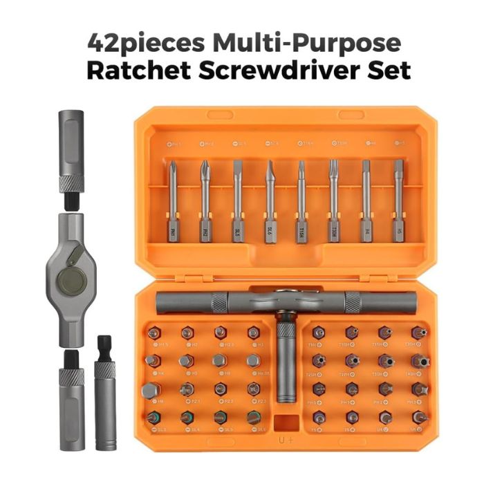 • Aluminum 42 in-1 Ratchet Torque Kit, Ratchet Screwdriver Kit. Our experienced technical team has redesigned the kit, including all the tools needed to repair furniture, including Phillips, Pentalobe, Torx, Hex, JS, Slotted, Triangle, Square, and more.